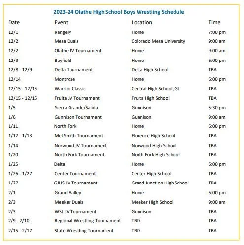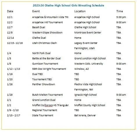 Welcome to the 2023-24 wrestling season! We look forward to seeing you at the matches this year. You can find the boys and girls Olathe High School match schedules below. You are also welcome to attend practice. Information on the Little Ships program will be added soon!